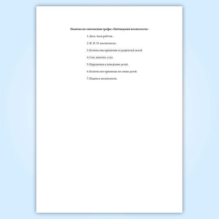 Одним из условий полноценного воспитания детей раннего возраста является правильное планирование воспитательно-образовательной работы, четкое ведение документации группы. Документация отражает состояние здоровья, ход и особенности развития каждого ребенка, помогает выяснить причины отклонений в развитии. Дети раннего возраста развиваются очень быстро и без четкого ведения документации весьма затруднительно следить за своевременностью появления у них тех или иных умений, навыков.