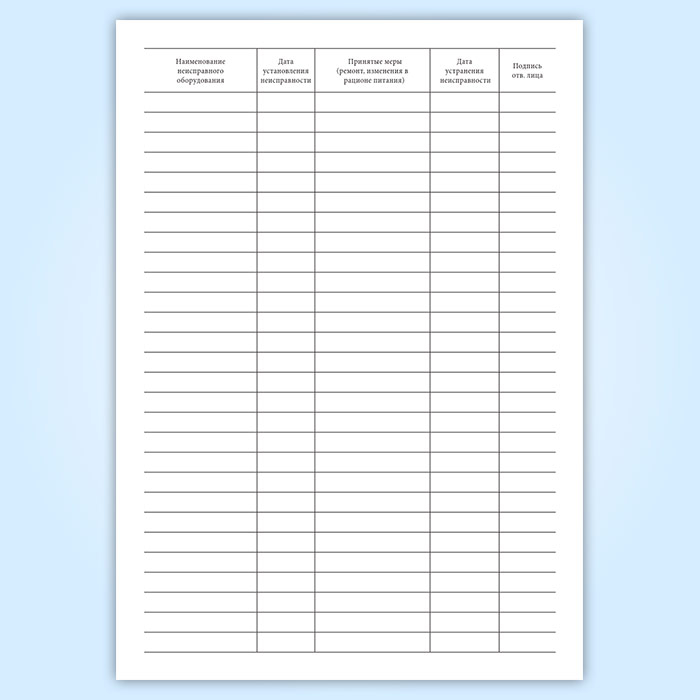 Форма журнала учета неисправностей технологического и холодильного оборудования соответствует Приложению 9 к Постановлению Главного государственного санитарного врача РФ № 25 "Об утверждении СанПиН 2.4.4.2599-10" (вместе с "СанПиН 2.4.4.2599-10. Гигиенические требования к устройству, содержанию и организации режима в оздоровительных учреждениях с дневным пребыванием детей в период каникул. Санитарно-эпидемиологические правила и нормативы") от 19.04.2010 года. , которые утратили силу.