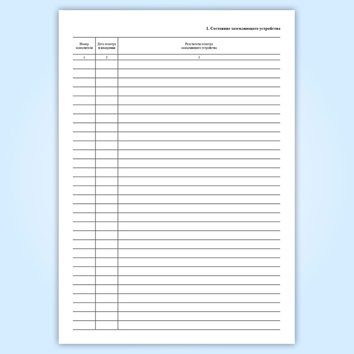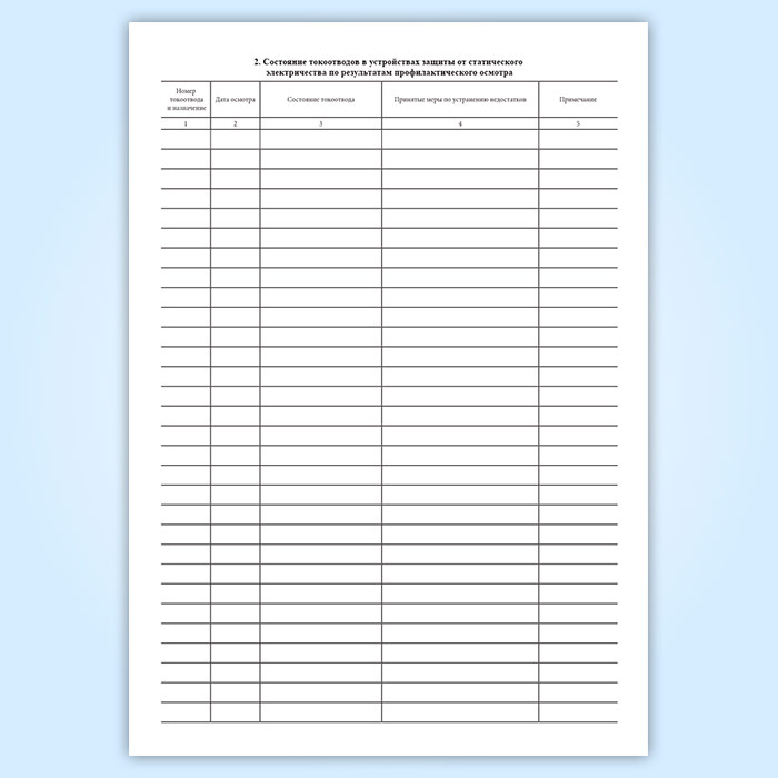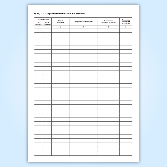 Результаты проверочных испытаний, осмотров и ремонтов защитных устройств должны заноситься в журнал по эксплуатации устройств для защиты от проявления статического электричества. К журналу должны быть приложены исполнительные схемы системы молниезащиты и защиты от статического электричества и акты о выборочных вскрытиях и осмотрах заземляющих устройств.