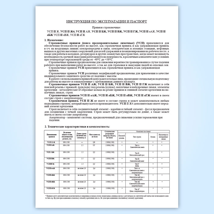 Страховочные привязи УСП различных модификаций предназначены для применения в качестве индивидуального защитного средства от падения с высоты.