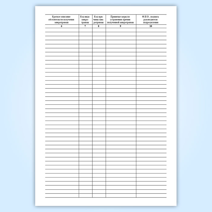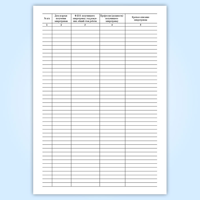 См. также Журнал учета микротравм, у которого горизонтальное положение и меньшее количество граф.