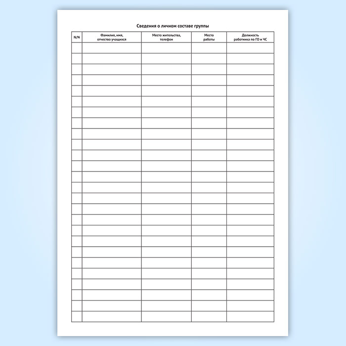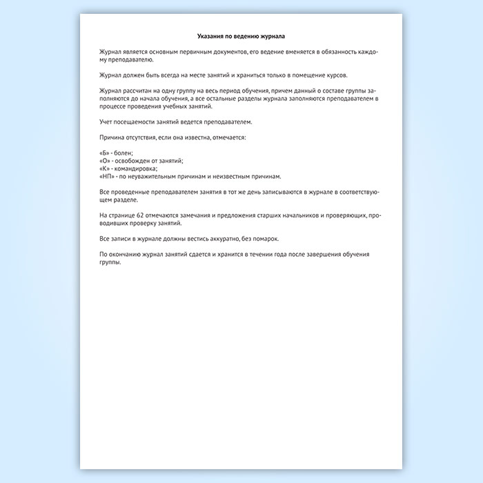 Журнал рассчитан на одну группу на весь период обучения, данные о составе группы заполняются до начала обучения, а все остальные разделы журнала заполняются преподавателем в процессе проведения учебных занятий.