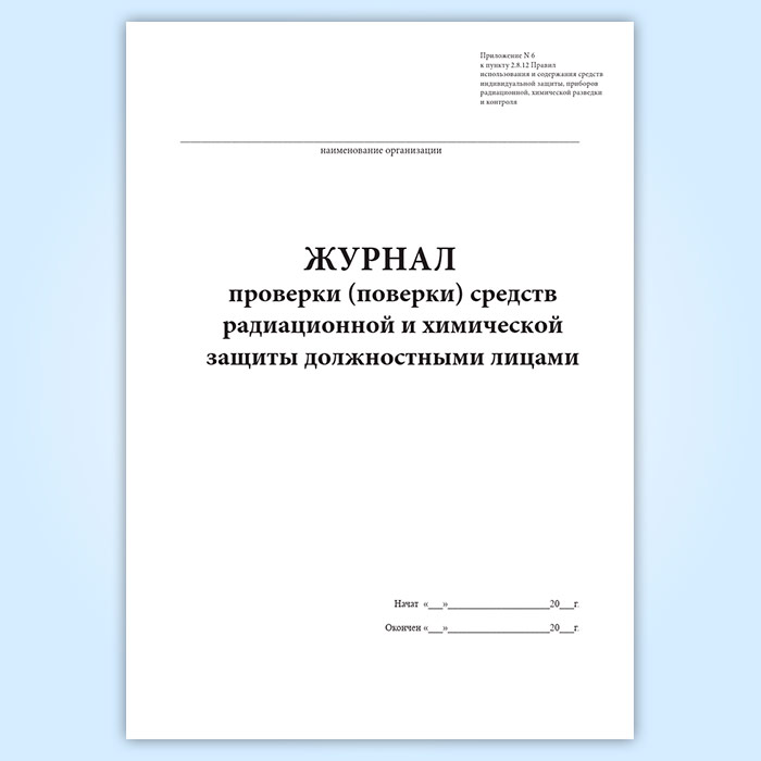Форма журнала проверки средств радиационной и химической защиты должностными лицами соответствует Приложению 6 к пункту 2.8.12 Приказа МЧС России от 27.05.2003 N 285. " Об утверждении и введении в действие Правил использования и содержания средств индивидуальной защиты, приборов радиационной, химической разведки и контроля" .