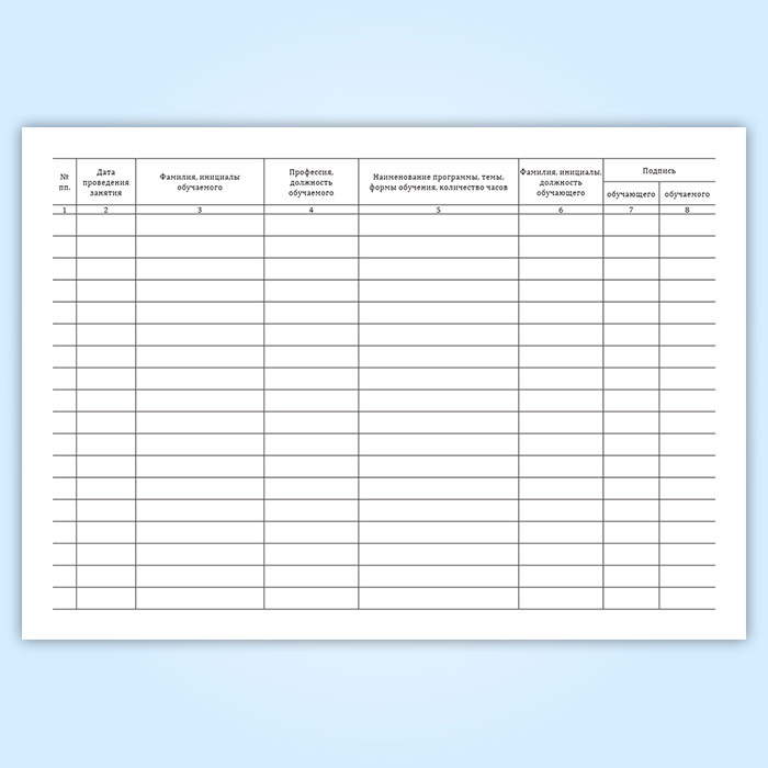 См. также журнал учета обучения работников по оказанию первой помощи при несчастных случаях на производстве, графы которого отличаются.