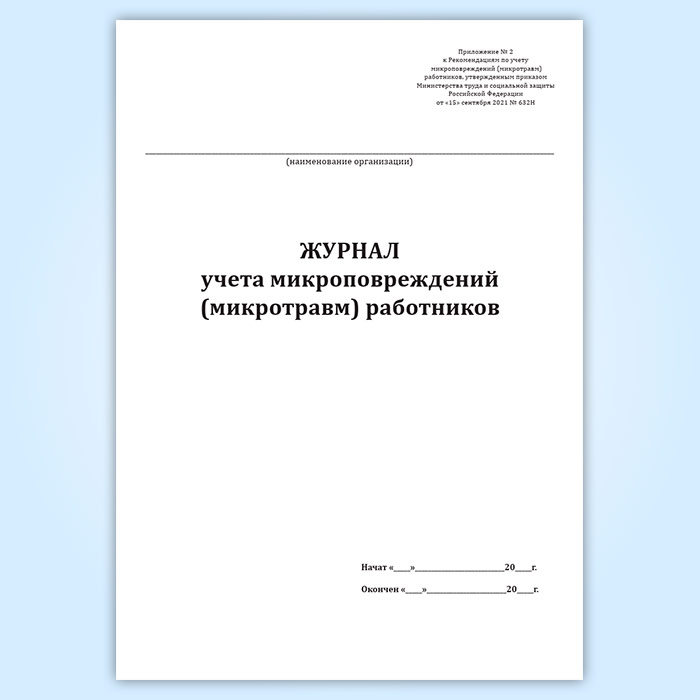 Форма Журнала учета микроповреждений (микротравм) работников соответствует Приложению № 2 к Рекомендациям по учету микроповреждений (микротравм) работников, утвержденным приказом Министерства труда и социальной защиты Российской Федерации от «15» сентября 2021 № 632H.