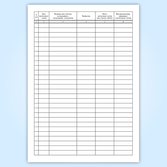 Журнал регистрации несчастных случаев на производстве, на торговых складах, базах и холодильниках имеет графы: