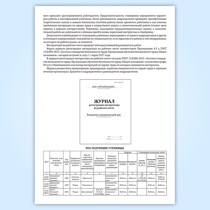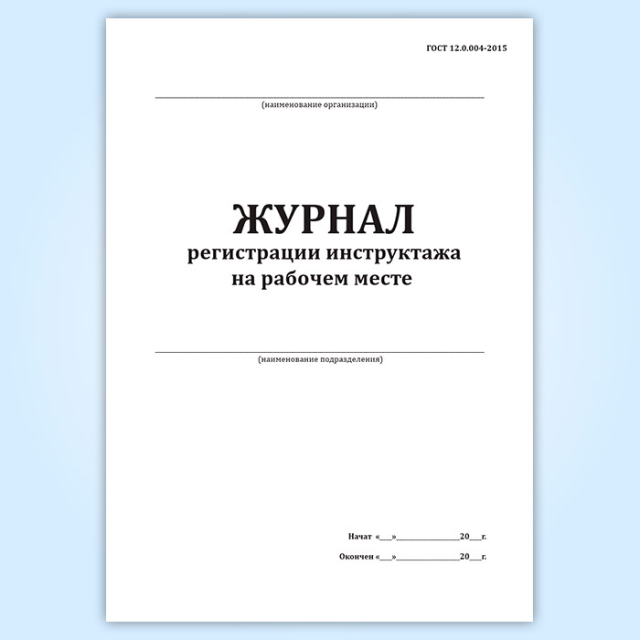 Форма журнала регистрации инструктажа на рабочем месте соответствует Приложению А.5 к ГОСТ 12.0.004-2015 Система стандартов безопасности труда. Организация обучения безопасности труда. Общие положения.