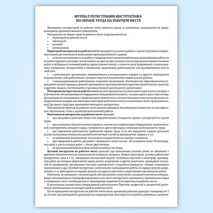 Проведение инструктажа на рабочем месте по охране труда и усвоение его содержания регистрируют и фиксируют в соответствующем журнале.
