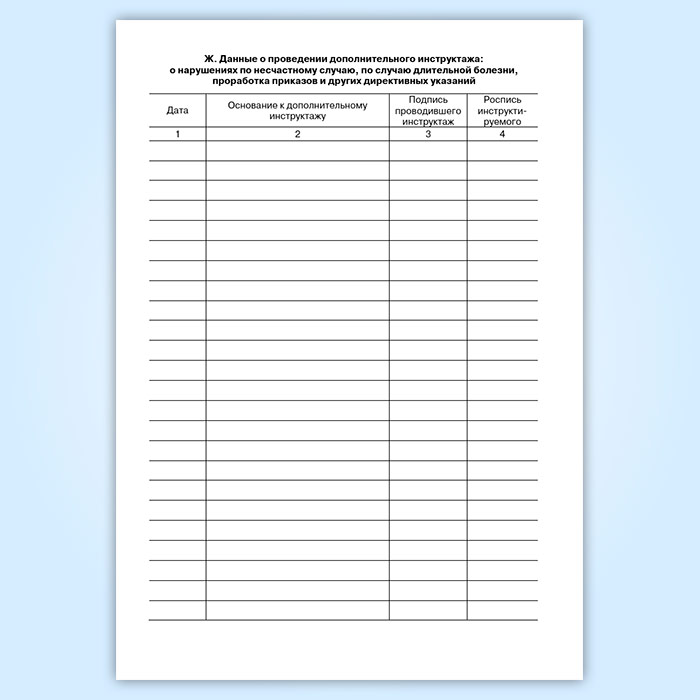 Ж. Данные о проведении дополнительного инструктажа: о нарушениях по несчастному случаю, по случаю длительной болезни, проработка приказов и других директивных указаний