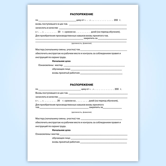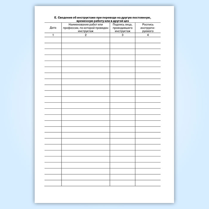 Е. Сведения об инструктаже при переводе на другую постоянную, временную работу, или в другой цех