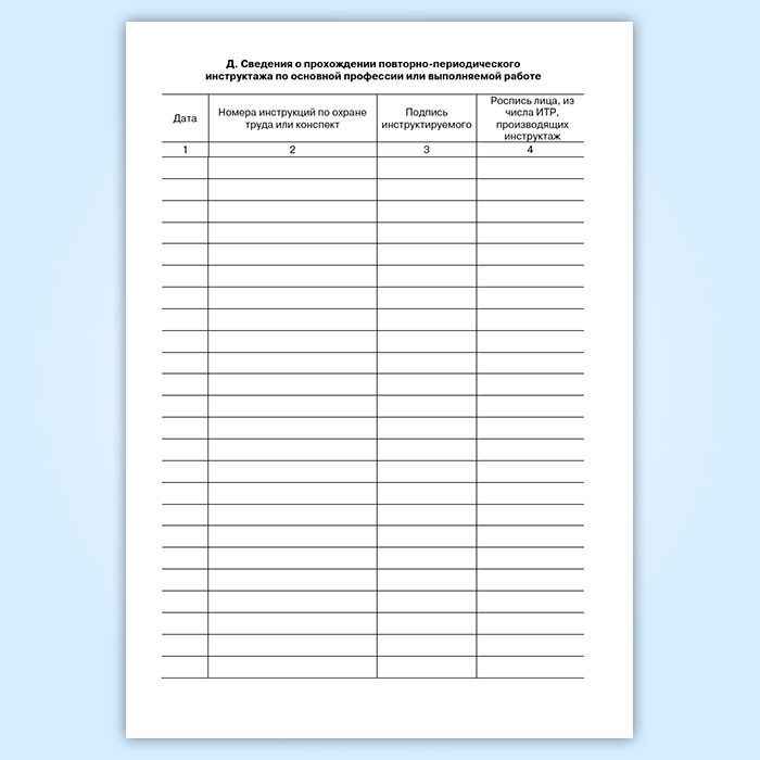 Д. Сведения о прохождении повторно-периодического инструктажа по основной профессии или выполняемой работе