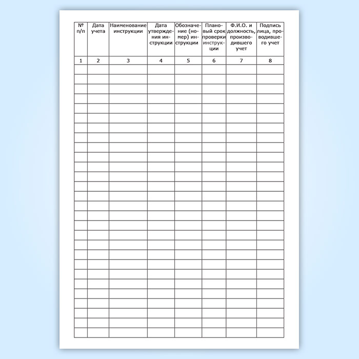 Учет инструкций по охране труда для работников осуществляется службой охраны труда (специалистом по охране труда) организации. Все инструкции по охране труда должны быть пронумерованы, прошиты и записаны в специальном журнале учета инструкций по охране труда для работников.