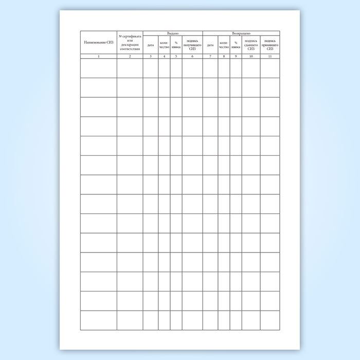 Журнал учета средств индивидуальной защиты содержит графы для заполнения:
