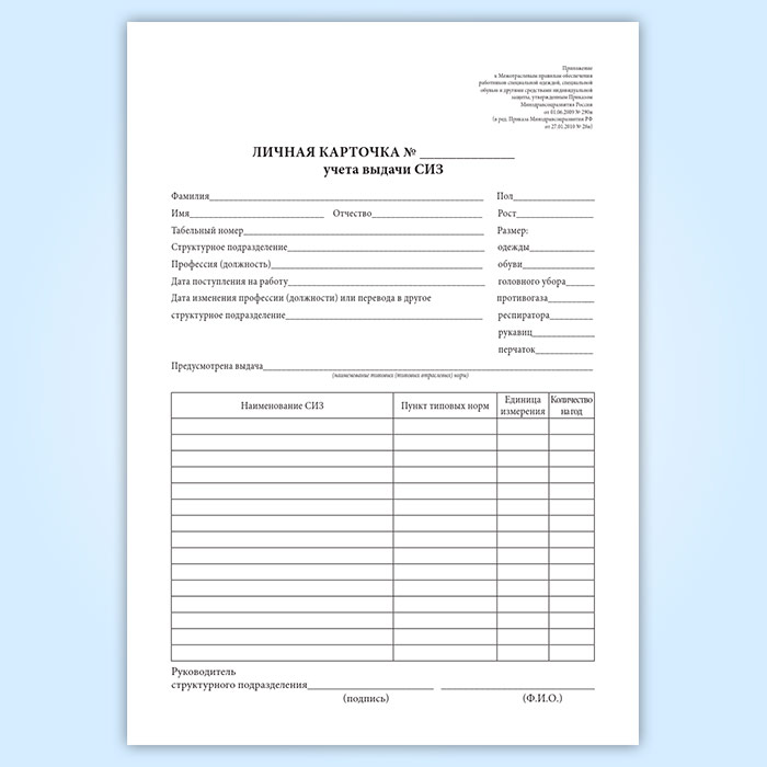 Журнал учета средств индивидуальной защиты состоит из личных карточек учета выдачи СИЗ, форма которых соответствует Приложению к Межотраслевым правилам обеспечения работников специальной одеждой, специальной обувью и другими средствами индивидуальной защиты.