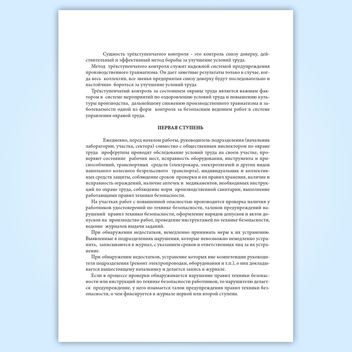Трёхступенчатый контроль за состоянием охраны труда является важным фактором в системе мероприятий по оздоровлению условий труда и повышению культуры производства, дальнейшему снижению производственного травматизма и заболеваемости одной из форм контроля за безопасным ведением работ в системе управления охраной труда.