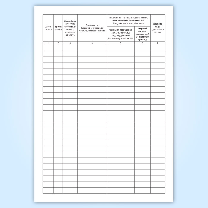 Книга учета посещений объекта и подключения сигнализации на ПЦН (пульт централизованного наблюдения) отдела вневедомственной охраны при ОВД (Форма 127 г) имеет графы: