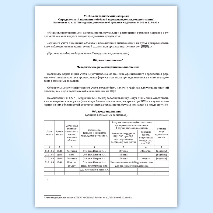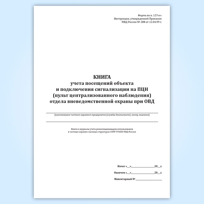 Книга учета посещений объекта и подключения сигнализации на ПЦН (пульт централизованного наблюдения) отдела вневедомственной охраны при ОВД (форма 127 г)