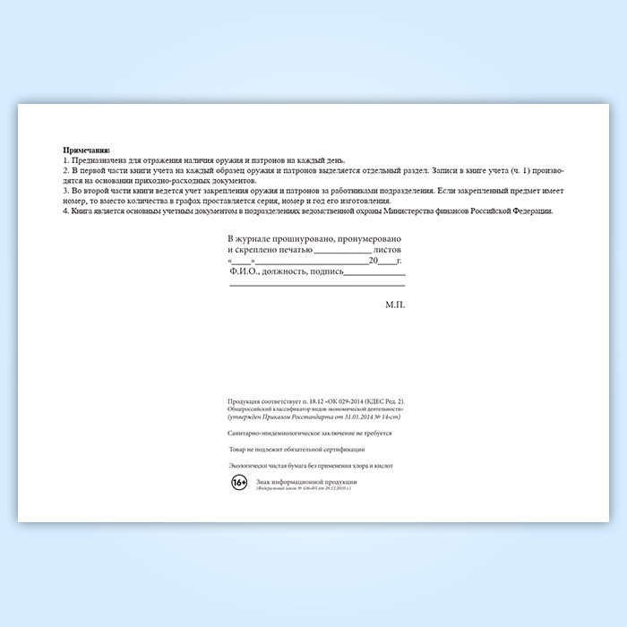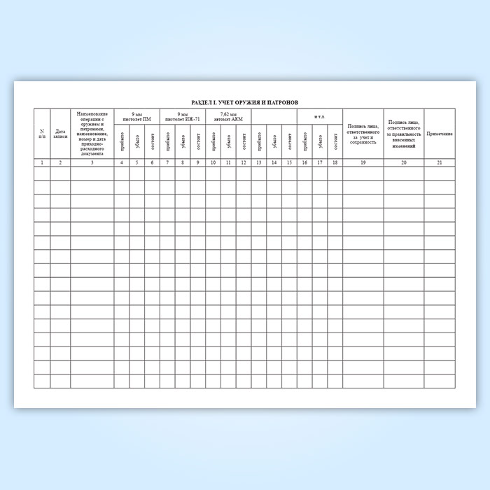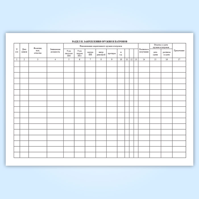 Книга учета и персонального закрепления оружия и патронов предназначена для отражения наличия оружия и патронов на каждый день.