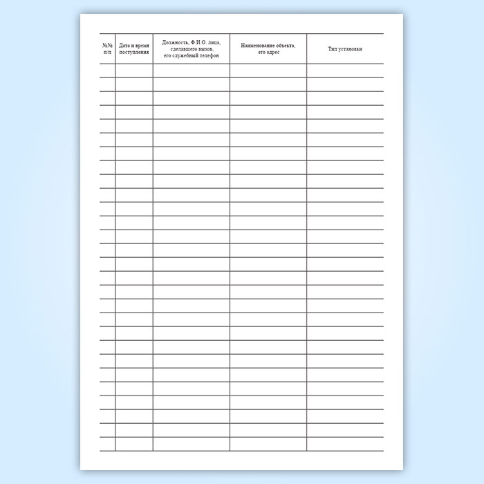 Форма журнала учета вызовов соответствует Приложению 11 к РД 25.964-90 " Система технического обслуживания и ремонта автоматических установок пожаротушения, дымоудаления, охранной пожарной и охранно-пожарной сигнализации организация и порядок проведения работ"