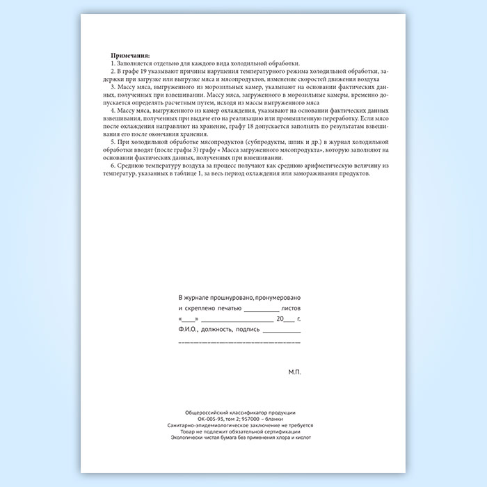 Основанием для записей в журнал холодильной обработки являются приемные документы с указанием термического состояния мяса и мясопродуктов (парное, остывшее, охлажденное, замороженное, оттаявшее, подмороженное) и их температура, а также отвесы на мясо, выгруженное из морозильных камер. Массу мяса, загруженного в морозильные камеры, временно разрешается определять расчетным путем, исходя из массы выгруженного мяса и мясопродуктов.