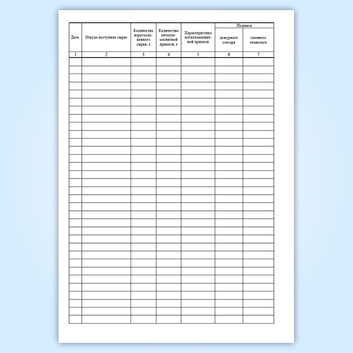 Графы журнала учета металломагнитной примеси в сырье (Форма №6):