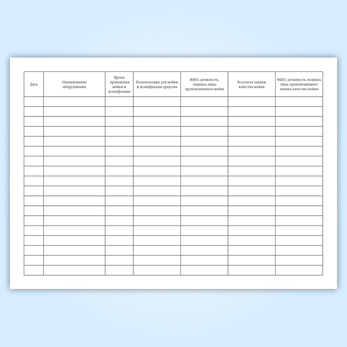 На предприятиях пищевой промышленности контроль мойки и дезинфекции технологического оборудования ведут с помощью журнала регистрации мойки и дезинфекции технологического оборудования с обязательным указанием даты и времени проведения мойки, а также ФИО ответственного и проверяющего.