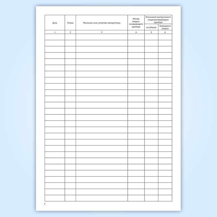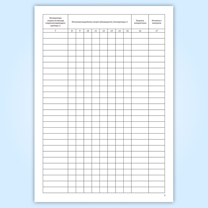 Для регистрации текущих показаний спиртоизмеряющих приборов организацией используется утвержденная Минсельхозом России форма журнала N 5-ПР, который должен заполняться операторами брагоректификационных (ректификационных), брагоперегонных и других технологических установок последней стадии производства этилового спирта. В этом журнале следует фиксировать почасовую выработку как непосредственно товарного спирта, так и содержащегося в нем безводного спирта по показаниям спиртоизмеряющих приборов, а также температуру спирта в приборах. На момент передачи производственной смены такое же фиксирование этих показателей производят оба оператора, которые совместно заверяют это своими подписями. Перед использованием указанный журнал должен быть пронумерован, прошнурован, скреплен печатью организации, подписан работником УМНС.