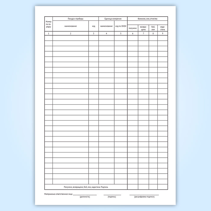 Журнал учета столовой посуды и приборов, выдаваемых подотчет сотрудникам предприятия (специализированная форма 16-ОПит)