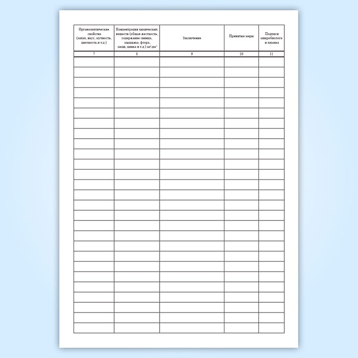 Заполняют по результатам анализов, выполняемых согласно Инструкции, ГОСТ Р 51232-98. Вода питьевая. Общие требования к организации и методам контроля качества.