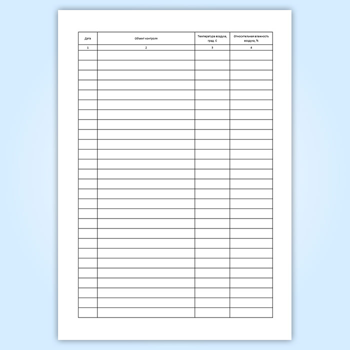 Форма журнала регистрации параметров микроклимата в производственных, складских помещениях и холодильных шкафах (камерах) соответствует Приложению 4 Методических указаний Главного государственного санитарного врача по г. Москве от 21.12.2001 N МОСМУ 5.1.008-01) Порядок и методика осуществления производственного контроля за соблюдением санитарных правил и выполнением санитарно-противоэпидемических (профилактических) мероприятий на предприятиях пищевой промышленности, общественного питания, продовольственной торговли.