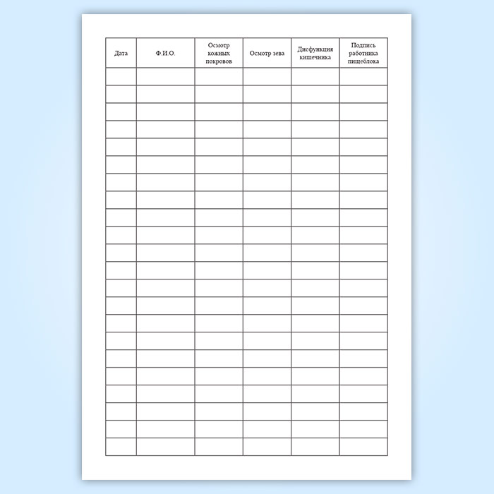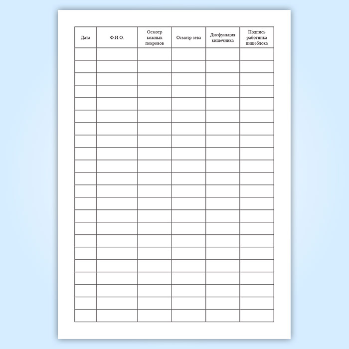 Вместо журнала осмотра работников пищеблока может применяться журнал осмотра рук и открытых частей тела на наличие гнойничковых заболеваний и других нарушений целостности кожного покрова.