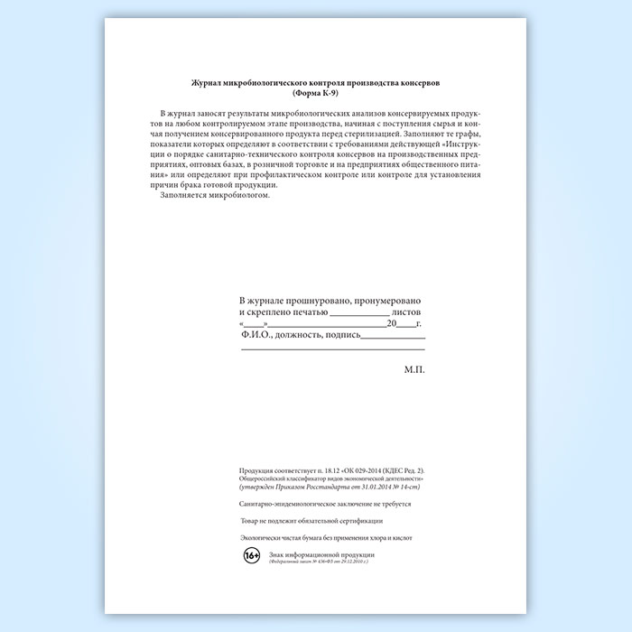 Журнал микробиологического контроля производства консервов (форма К-9)