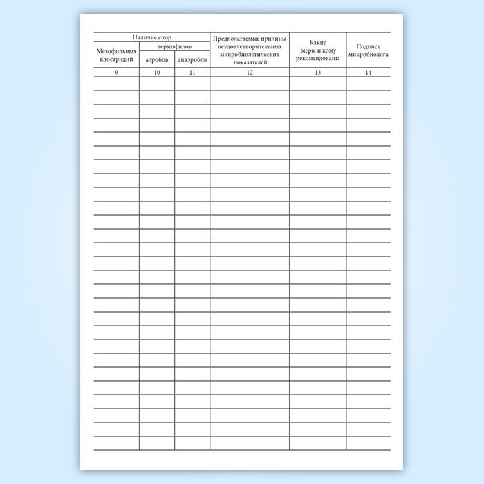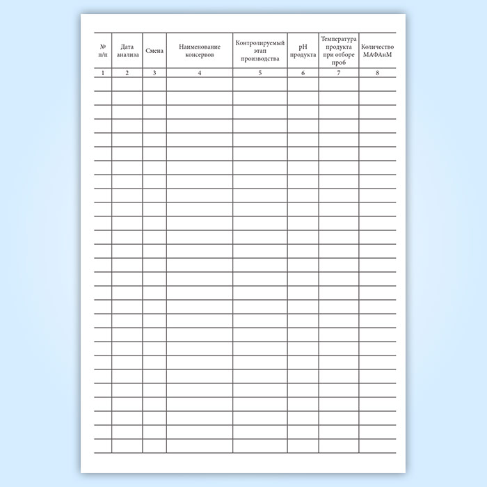 В журнал заносят результаты микробиологических анализов консервируемых продуктов на любом контролируемом этапе производства, начиная с поступления сырья и кончая получением консервированного продукта перед стерилизацией. Микробиологический контроль проводят по мере необходимости согласно Инструкции.