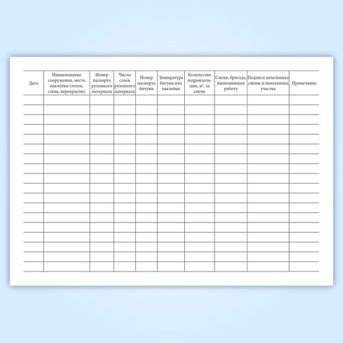 Форма журнала производства работ по устройству оплавляемой и оклеечной гидроизоляции соответствует Приложению 5 к ВСН 104-93 "Нормы по проектированию и устройству гидроизоляции тоннелей метрополитенов, сооружаемых открытым способом"