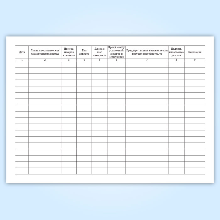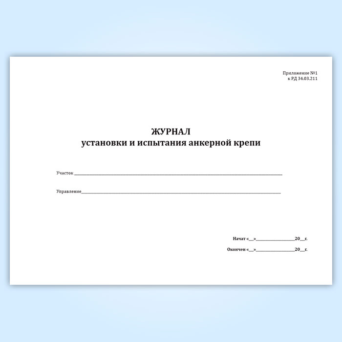 Форма журнала установки и испытания анкерной крепи соответствует Приложению №1 к РД 34.03.211 Инструкция по технике безопасности при ведении крепежных работ в подземных выработках на строительстве гидроэлектростанции, которая утратила силу.