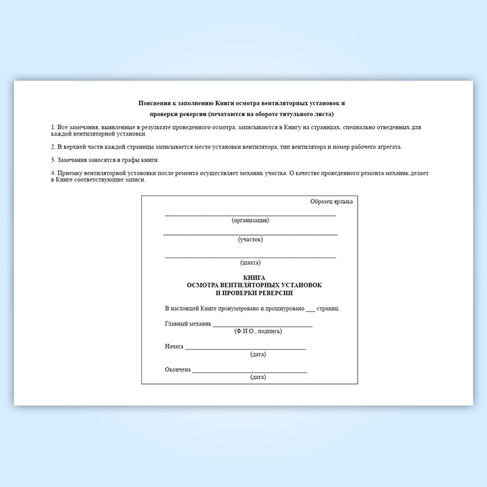 Форма книги осмотра вентиляторных установок и проверки реверсии соответствует Приложению 19 к ПБ 03-428-02 Правилам безопасности при строительстве подземных сооружений.