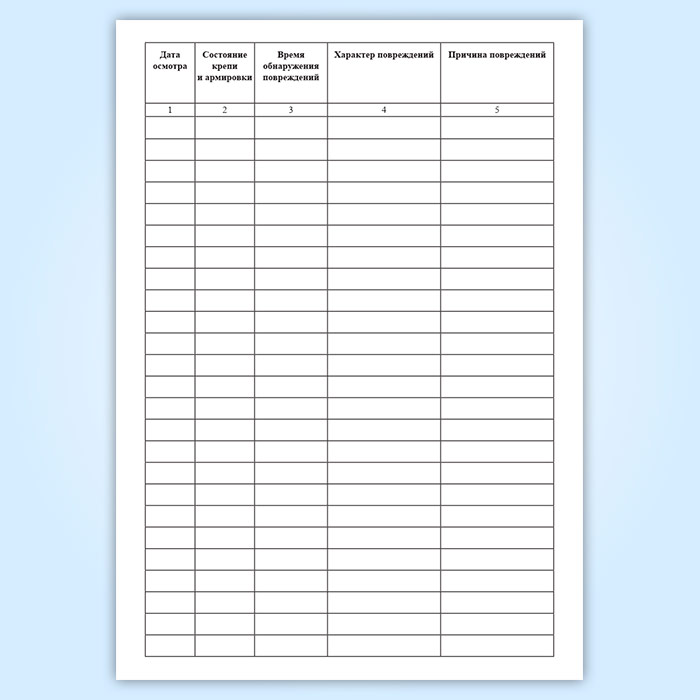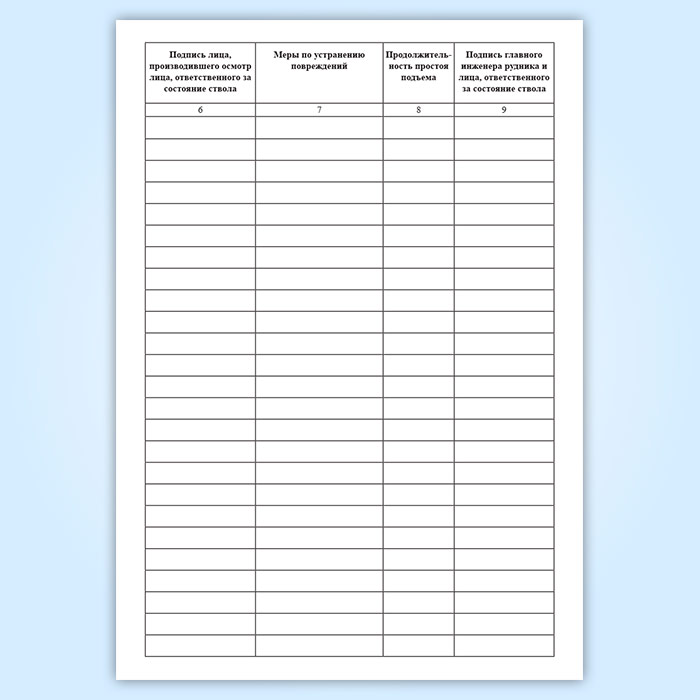 В журнале записываются все замечания, неисправности, повреждения проводников и крепи ствола, а также трубопроводов и нарушения в прокладке кабельных линий, препятствующих нормальной работе подъема. При отсутствии замечаний в графе 2 делается запись «Состояние удовлетворительное». Журнал должен быть прошнурован, пронумерован и скреплен печатью. Лица, заполняющие соответствующие графы, расписываются в прочтении правил заполнения журнала.