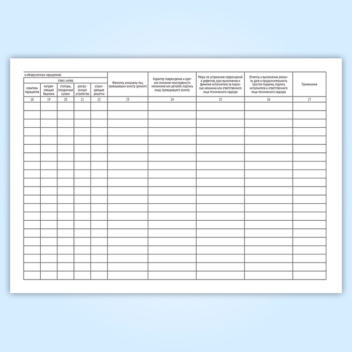 26. Отметка о выполнении ремонта, дата и продолжительность простоя подъема, подпись исполнителя и ответственного лица технического надзора