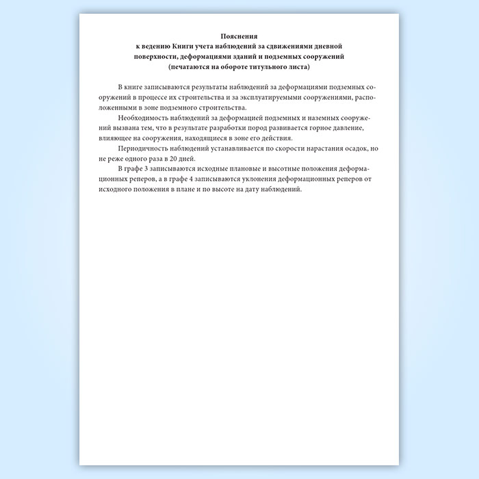 В книге записываются результаты наблюдений за деформациями подземных сооружений в процессе их строительства и за эксплуатируемыми сооружениями, расположенными в зоне подземного строительства.