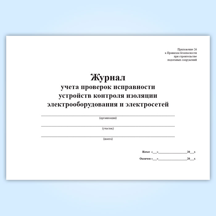 Форма журнала учета проверок исправности устройств контроля изоляции электрооборудования и электросетей соответствует Приложению 25 к ПБ 03-428-02. Правила безопасности при строительстве подземных сооружений.