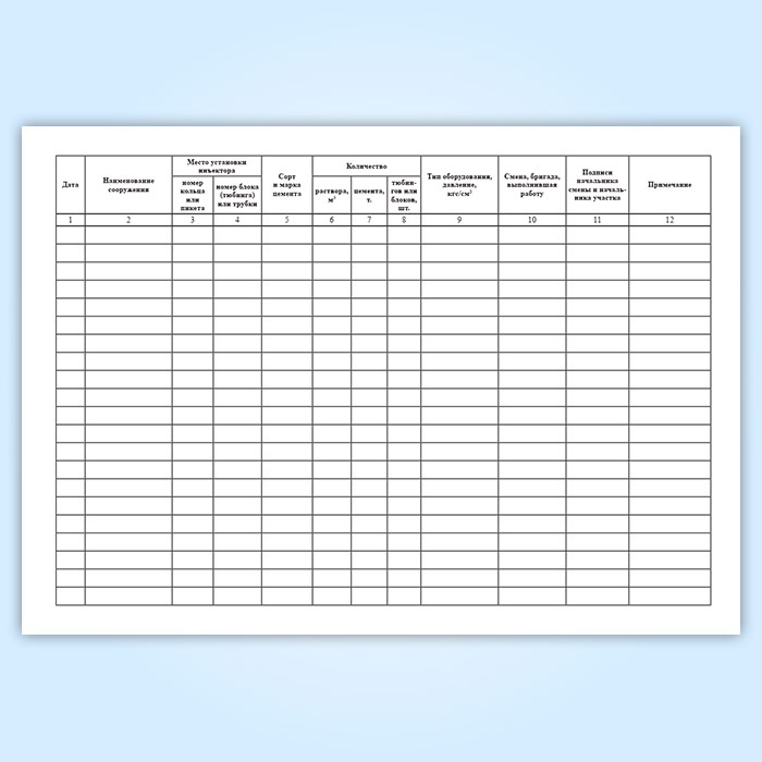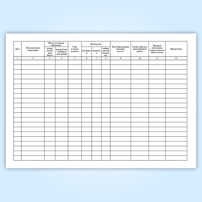 Форма журнала контрольного нагнетания цемента за обделку соответствует Приложению 7.2Д СП 32-105-2004. Метрополитены (одобрен Письмом Госстроя РФ от 23.03.2004 N ЛБ-1912/9).