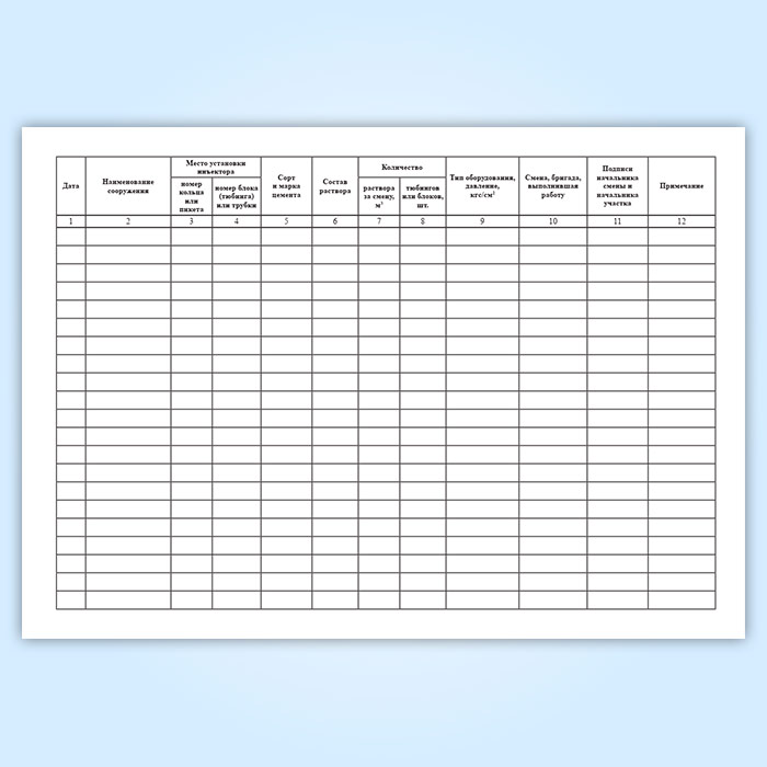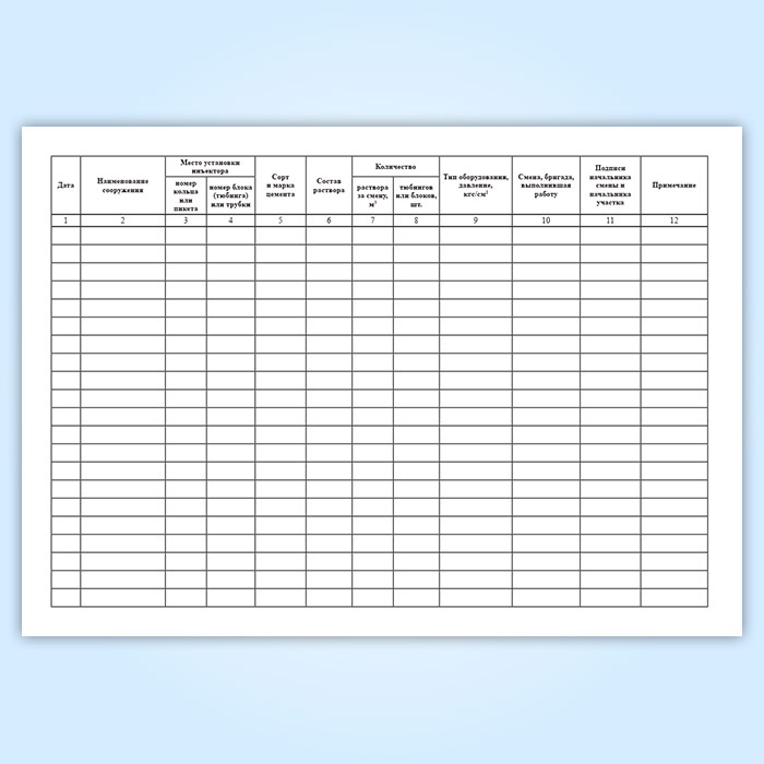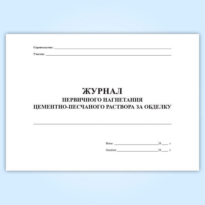 Форма журнала первичного нагнетания цементно-песчаного раствора за обделку соответвует Приложению 7.2Г к СП 32-105-2004. Метрополитены (одобрен Письмом Госстроя РФ от 23.03.2004 N ЛБ-1912/9).