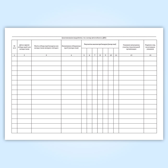 Форма книги учета результатов анализа проб воздуха на загазованность и запыленность соответствует Приложению 22 к Правилам безопасности при строительстве подземных сооружений. ПБ 03-428-02.