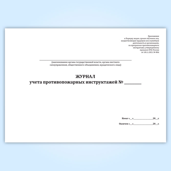 Форма Журнала учета противопожарных инструктажей соответствует приложению к Приказу МЧС России от 18.11.2021 N 806 " Об определении Порядка, видов, сроков обучения лиц, осуществляющих трудовую или служебную деятельность в организациях, по программам противопожарного инструктажа, требований к содержанию указанных программ и категорий лиц, проходящих обучение по дополнительным профессиональным программам в области пожарной безопасности"