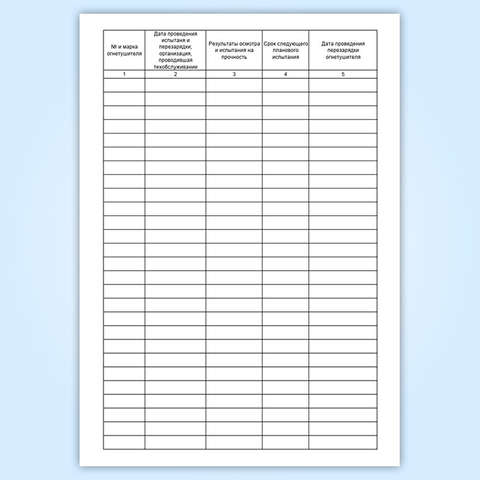 Форма журнала проведения испытаний и перезарядки огнетушителей соответствует Таблице Г.3. СП 9.13130.2009. Свод правил. Техника пожарная. Огнетушители. Требования к эксплуатации", а также Приложению 5 к НПБ 166-97 Пожарная техника. Огнетушители. Требования к эксплуатации, который утратил силу.