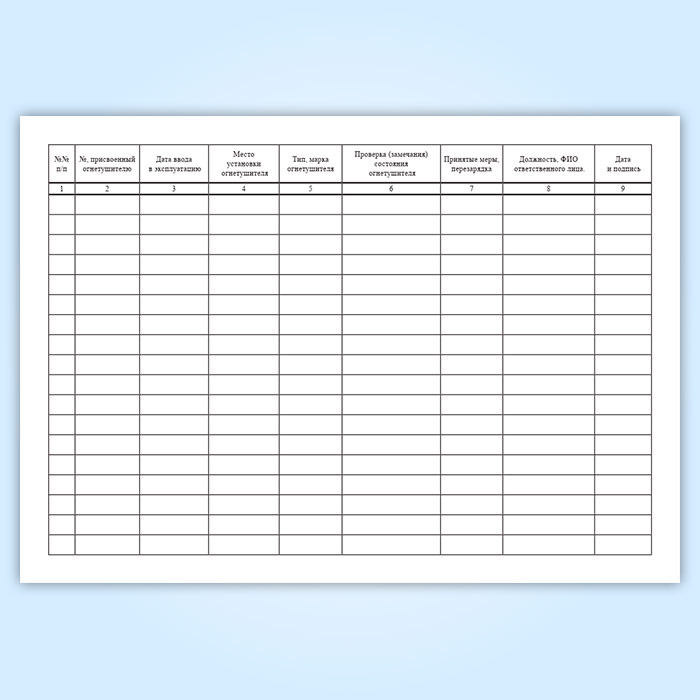 Форма журнала учета и проверки огнетушителей соответствует действующими Правилами противопожарного режима в Российской Федерации.