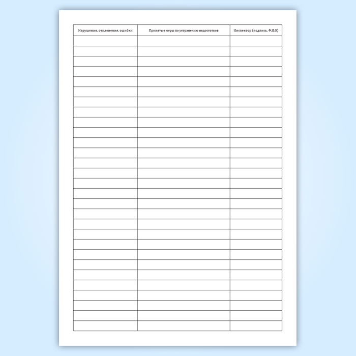 Инспектор обязан провести разбор замечаний, дать конкретное задание и указать сроки устранения недостатков. Организация после инспекции должна провести разбор результатов проверки и доложить лицу, проводившему инспекцию, об устранении недостатков. Инспектирующие лица записывают результаты инспекции в Журнал инспекционных проверок.