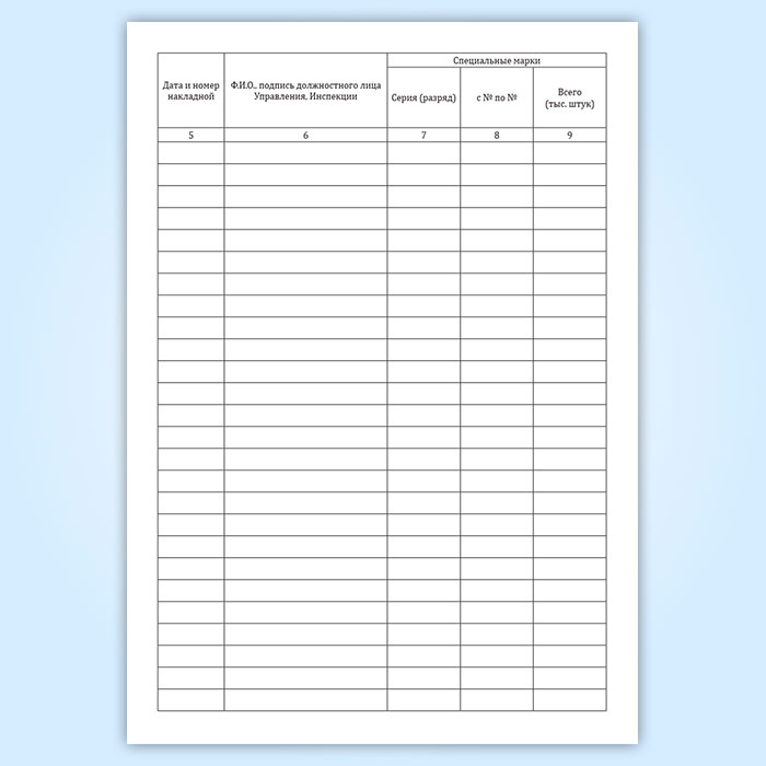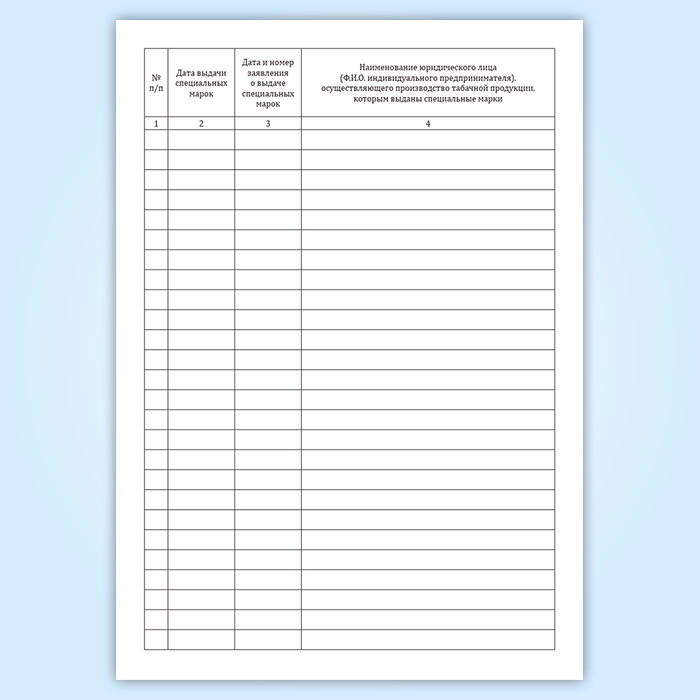 Учет выдачи специальных марок Управлением, Инспекцией заявителям производится в журнале, где фиксируют наименование юридического лица (Ф.И.О. индивидуального предпринимателя), осуществляющего производство табачной продукции, которым выданы специальные марки.