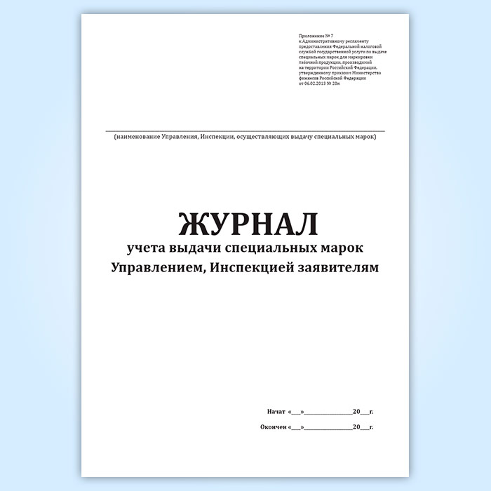 Форма журнала учета выдачи специальных марок Управлением, Инспекцией заявителям соответствует Приложению 7 к Приказу Минфина России от 06.02.2013 N 20н " Об утверждении Административного регламента предоставления Федеральной налоговой службой государственной услуги по выдаче специальных марок для маркировки табачной продукции, производимой на территории Российской Федерации, образца специальной марки, форм документов и Правил хранения специальных марок, предусмотренных постановлением Правительства Российской Федерации от 26 января 2010 г. N 27, и признании утратившим силу приказа Министерства финансов Российской Федерации от 11 июня 2010 г. N 59н.