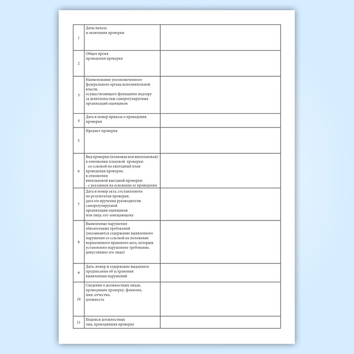 Журнал учета проверок саморегулируемой организации оценщиков, проводимых уполномоченным федеральным органом исполнительной власти, осуществляющим функции по надзору за деятельностью саморегулируемых организаций оценщиков содержит строки для заполнения:
